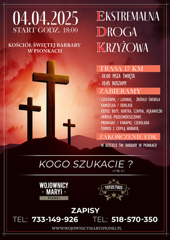 Zapraszamy do wzięcia udziału w Ekstremalnej Drodze Krzyżowej, która odbędzie się w dniu 04.04.2025r. Rozpoczniemy o godz. 18:00 Mszą Świętą w Kościele Parafia pw św. Barbary w Pionkach, ul. Al. Jana Pawła II 1. Po Mszy Świętej wyruszymy na trasę liczącą około 17 km, by wspólnie przejść Drogę Krzyżową. Zakończenie Ekstremalnej Drogi Krzyżowej odbędzie się ponownie w Kościele Św. Barbary, gdzie uczestnicy otrzymają uroczyste błogosławieństwo.