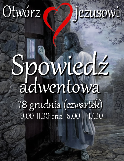 18 grudnia w czwartek w naszej świątyni przeżyjemy spowiedź Parafialną w godzinach 9.00-11.30 oraz 16.00–17.30. W dniu spowiedzi będzie dodatkowa Msza św. o godz. 10.30 ale już bez sakramentu chorych.